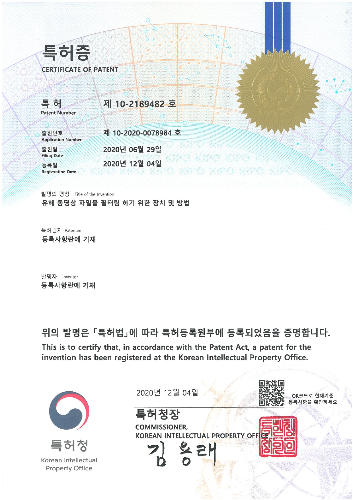 특허증(제10-2189482호)_유해 동영상 파일을 필터링 하기 위한 장치 및 방법