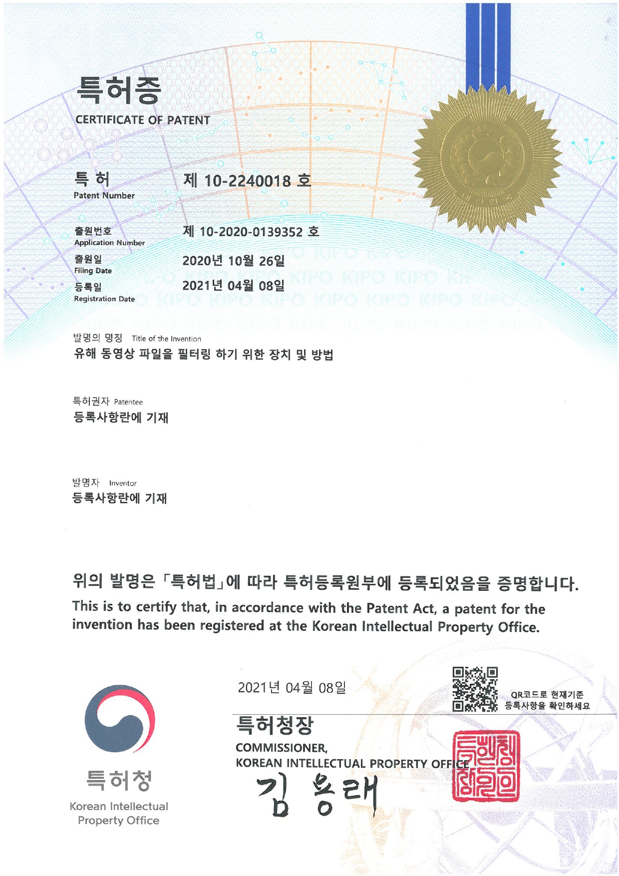 특허증(제10-2240018호)_유해동영상 파일을 필터링 하기 위한 장치 및 방법