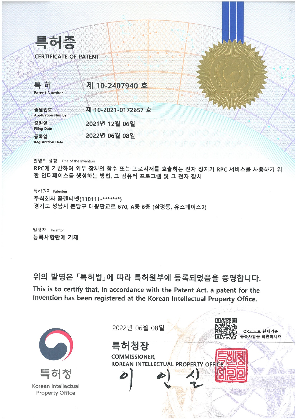 특허증(제10-2407940호)_RPC에 기반하여 외부 장치의 함수 또는 프로시저를 호출하는 전자 장치 RPC 서비스를 사용하기 위한 인터페이스를 생성하는 방법