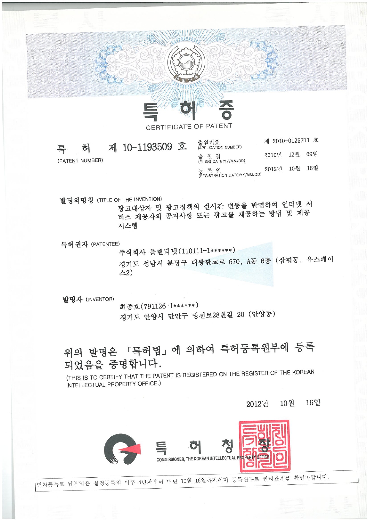 특허증(제10-1193509호)_광고대상자 및 광고정책의 실시간 변동을 반영하여 인터넷 서비스 제공자의 공지사항 또는 광고를 제공하는 방법 및 제공시스템_pag