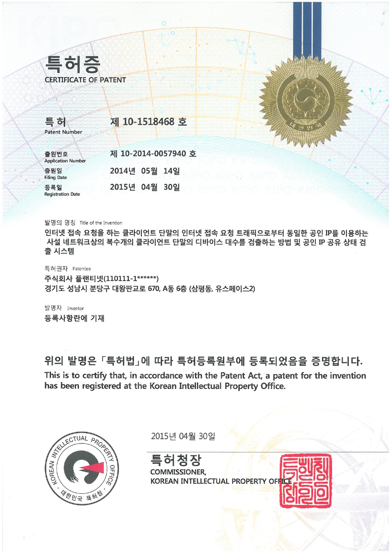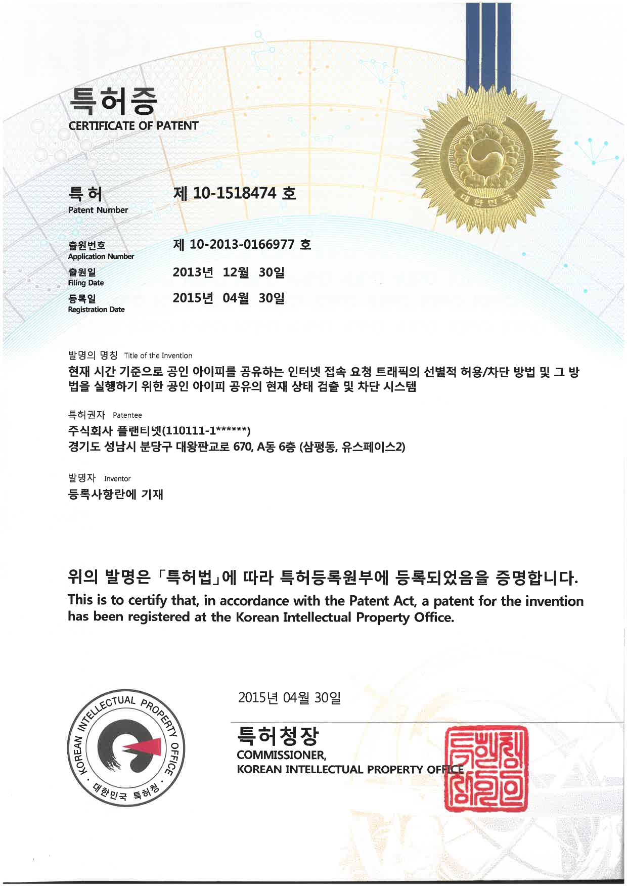 특허증(제10-1518474호)_현재시간 기준으로 공인 아이피를 공유하는 인터넷 접속 요청 트랙픽의 선별적 허용 차단 방법