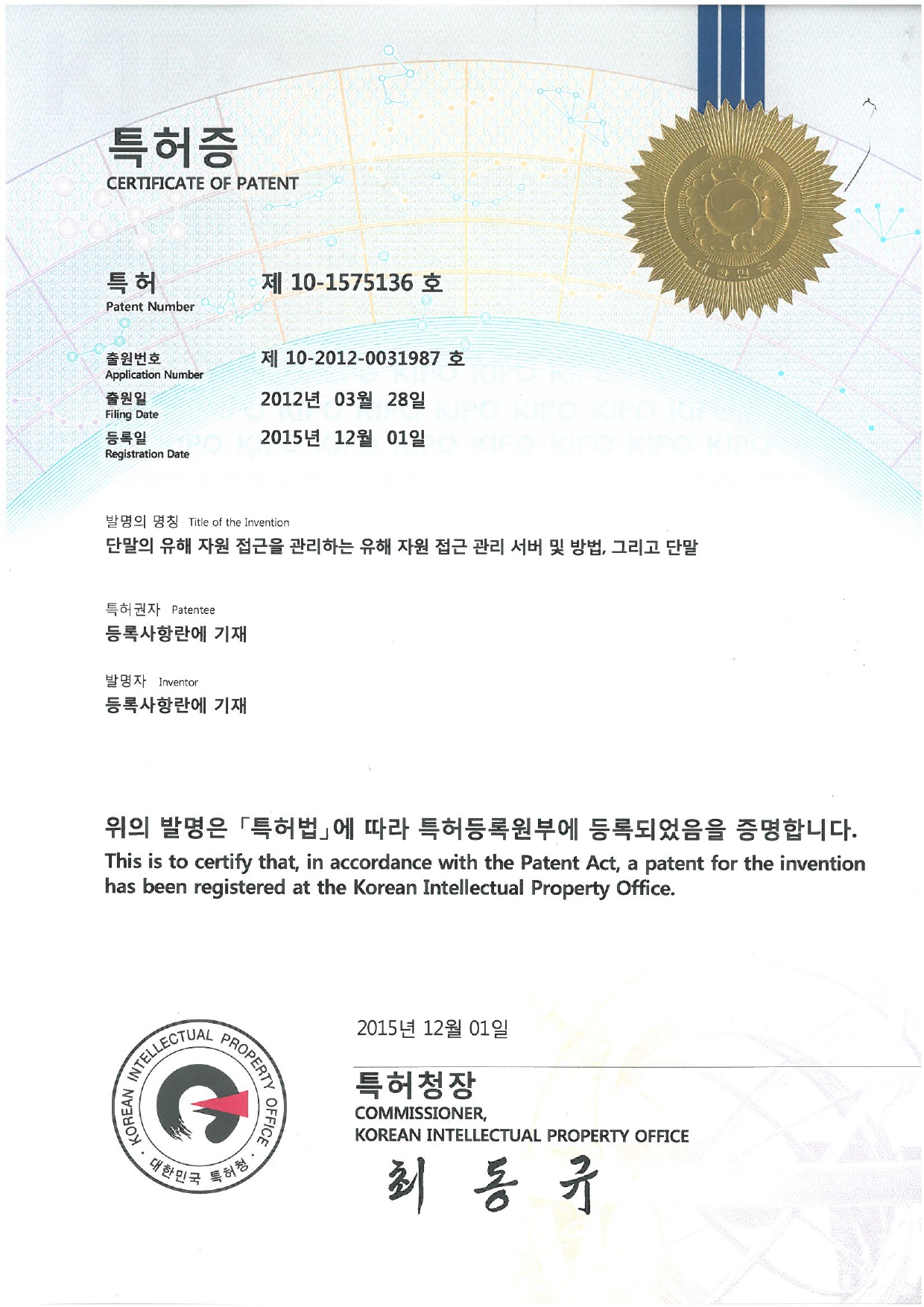 특허증(제10-1575136호)_단말의 유해 자원 접근을 관리하는 유해 자원 접근 관리 서버 및 방법, 그리고 단말