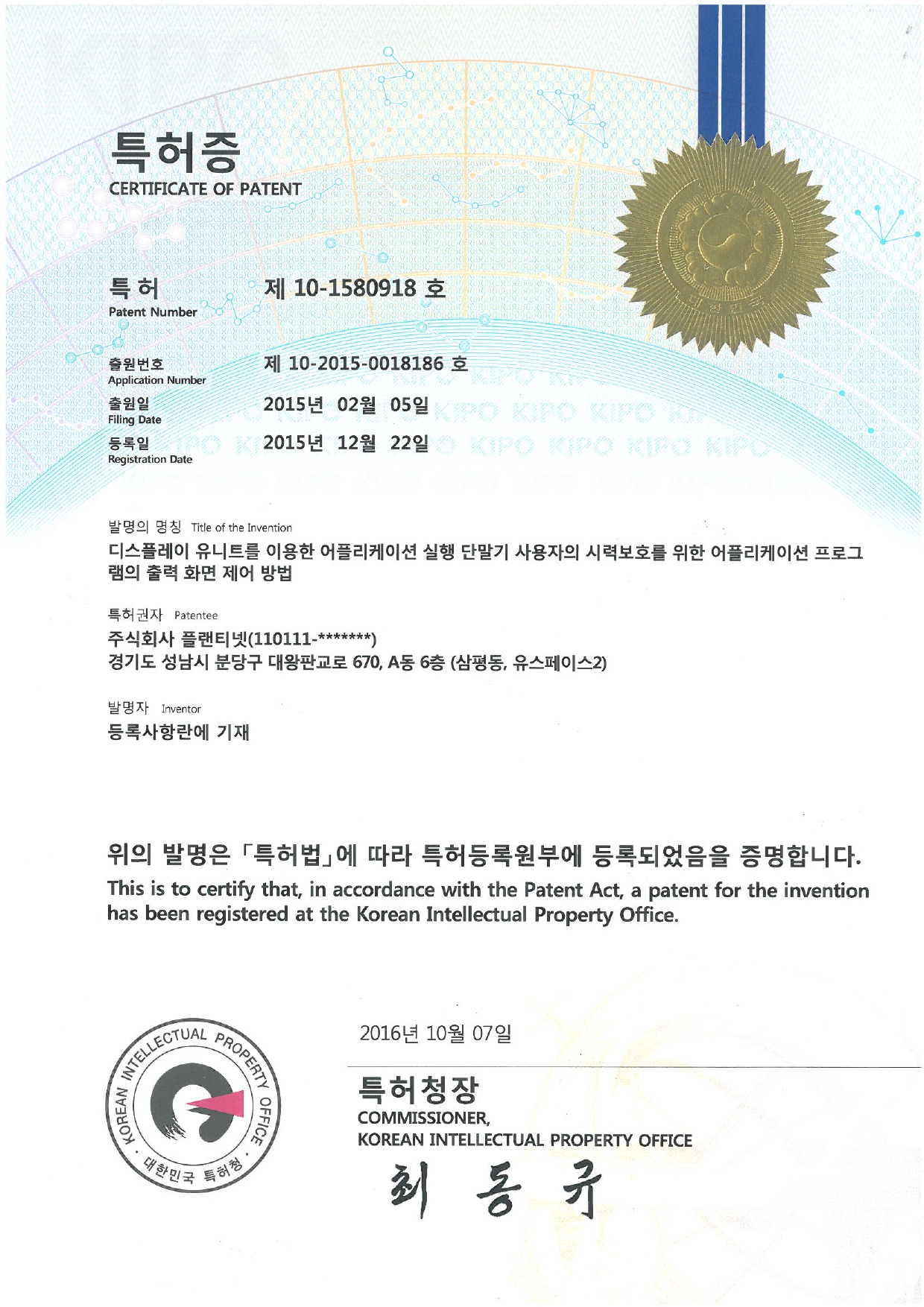 특허증(제10-1580918호)_디스플레이 유니트를 이용한 어플리케이션 실행 단말기 사용자의 시력보호를 위한 어플리케이션 프로그램의 출력 화면 제어 방법
