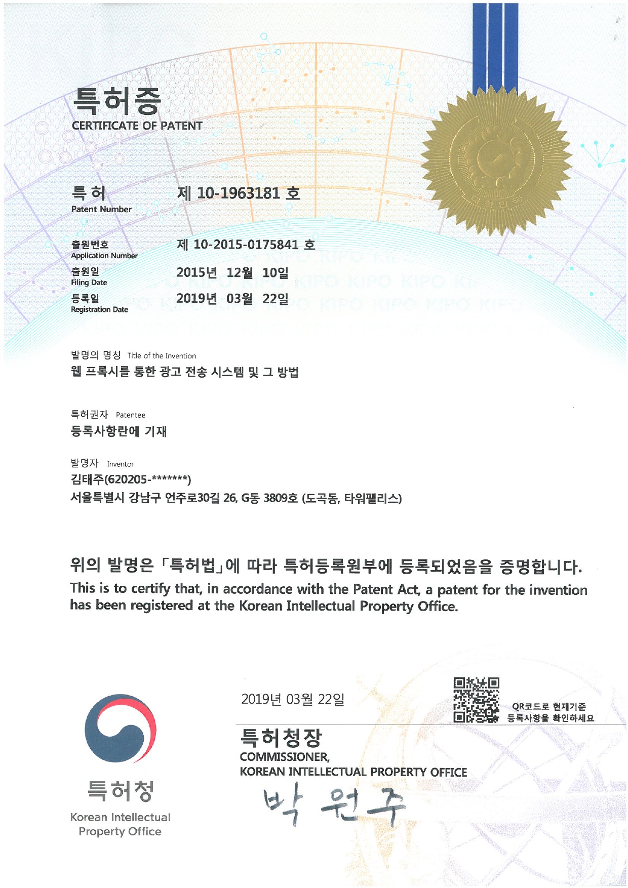 특허증(제10-1963181호)_웹 프록시를 통한 광고 전송 시스템 및 그 방법