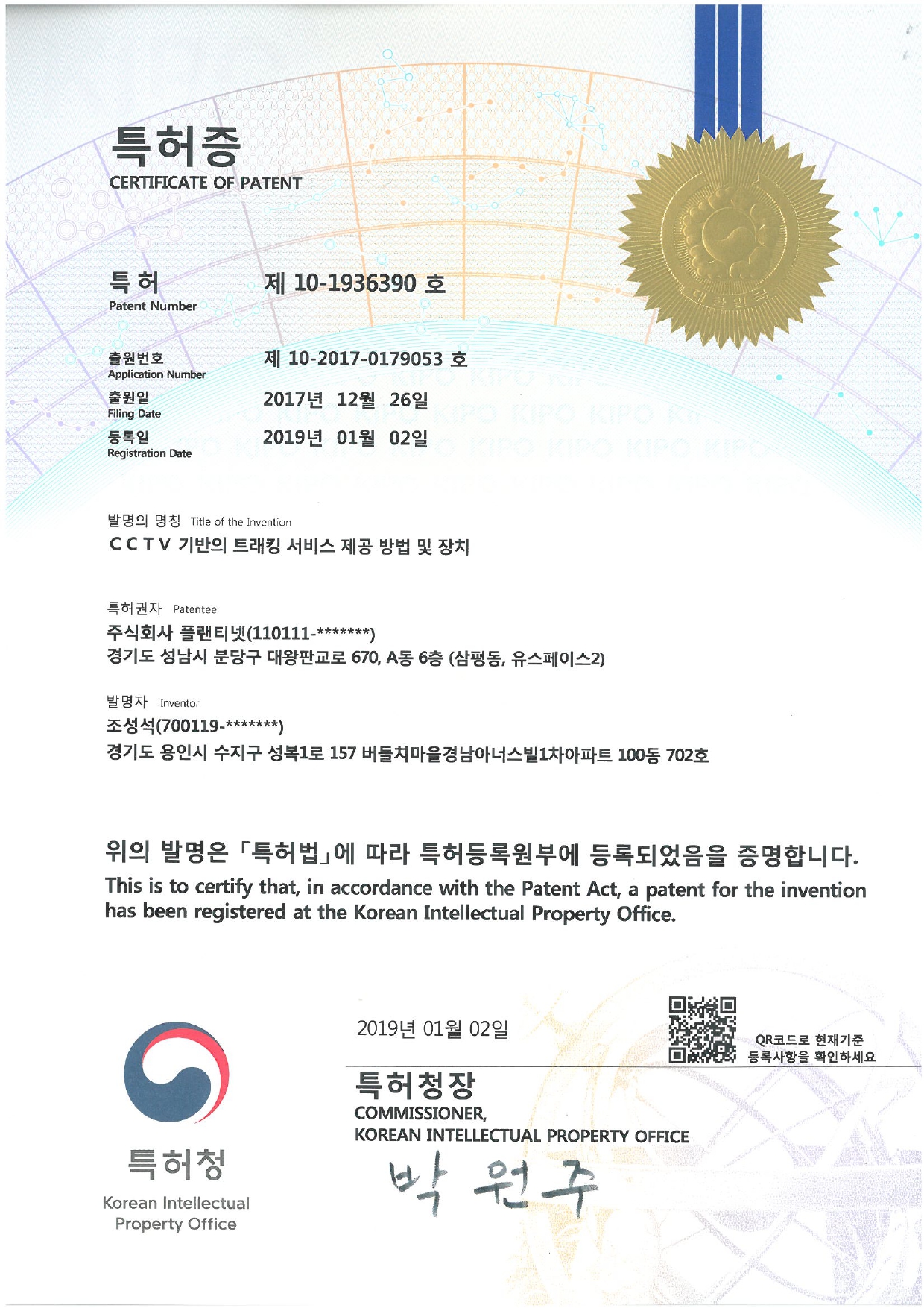특허증(제10-1936390호)_CCTV기반의 트래킹 서비스 제공 방법 및 장치