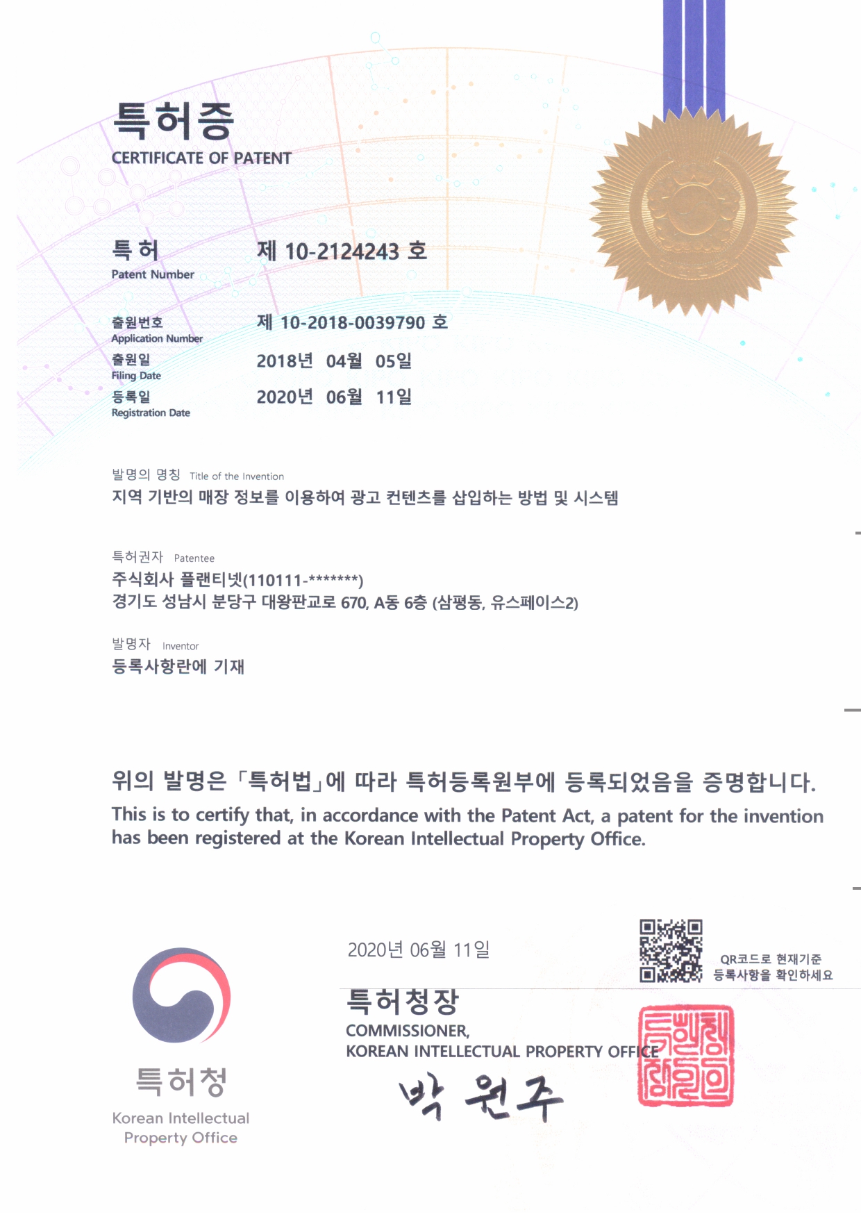특허증(제 10-2124243)_지역 기반의 매장 정보를 이용하여 광고 컨텐츠를 삽입하는 방법 및 시스템