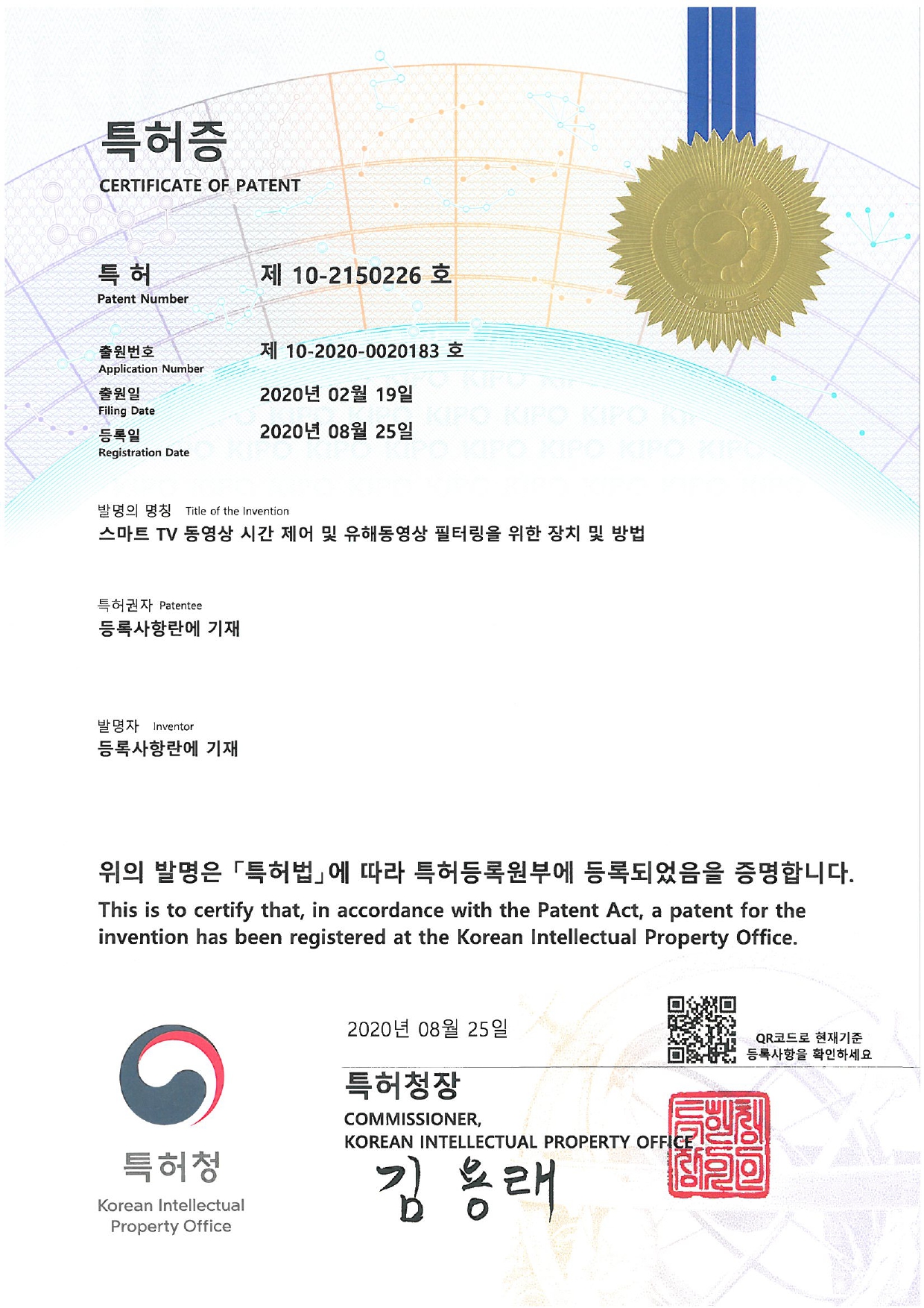 특허증(제10-2150226호)_스마트 TV 동영상 시간 제어 및 유해동영상 필터링을 위한 장치 및 방법