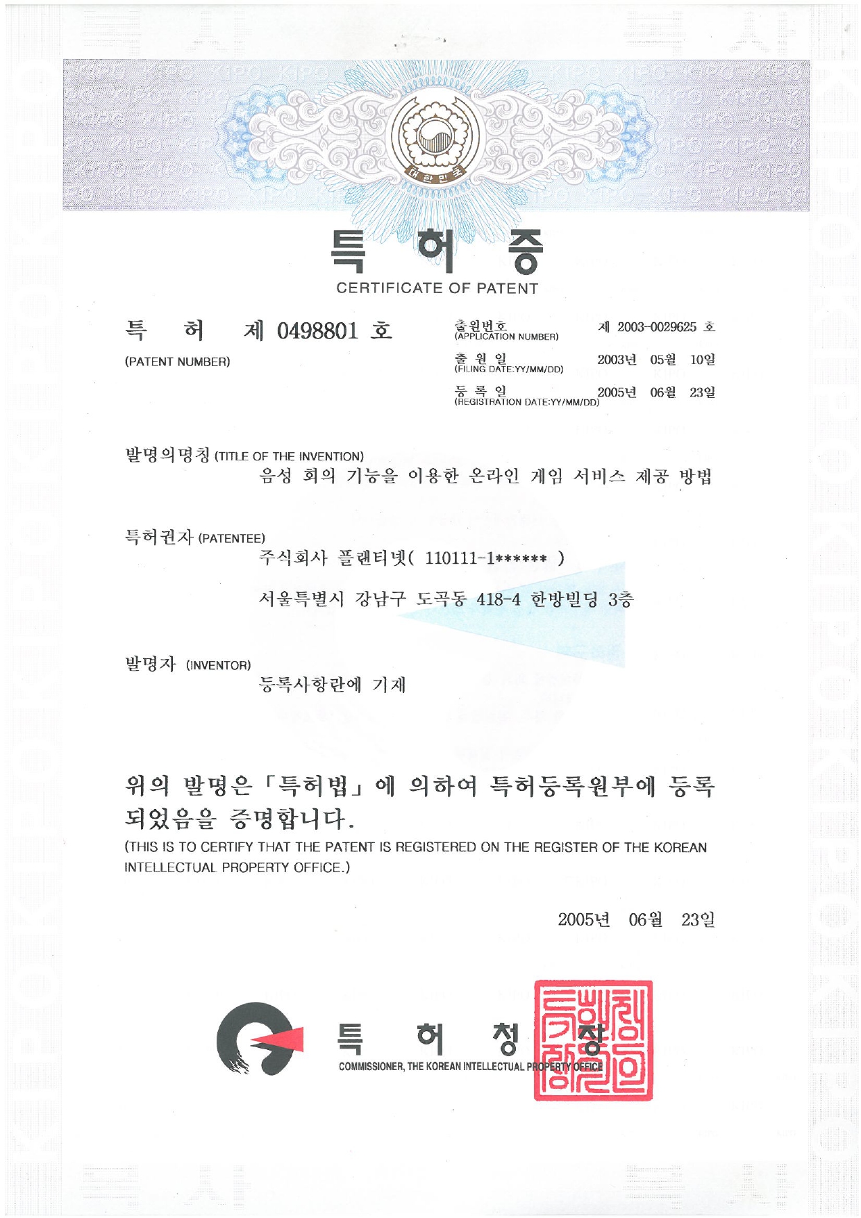 특허증(제0498801호)_음성회의 기능을 이용한 온라인 게임 서비스 제공 방법