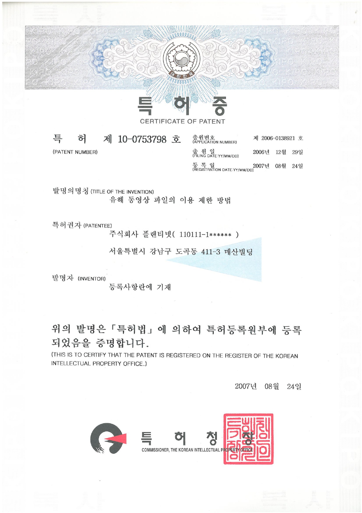 특허증(제10-0753798호)_유해 동영상 파일의 이용 제한 방법