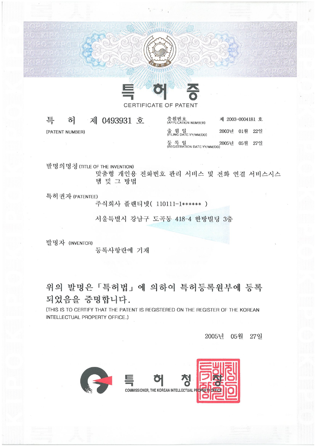 특허증(제0493931호)_맞춤형 개인용 전화번호 관리 서비스 및 전화 연결 서비스시스템 및 그 방법