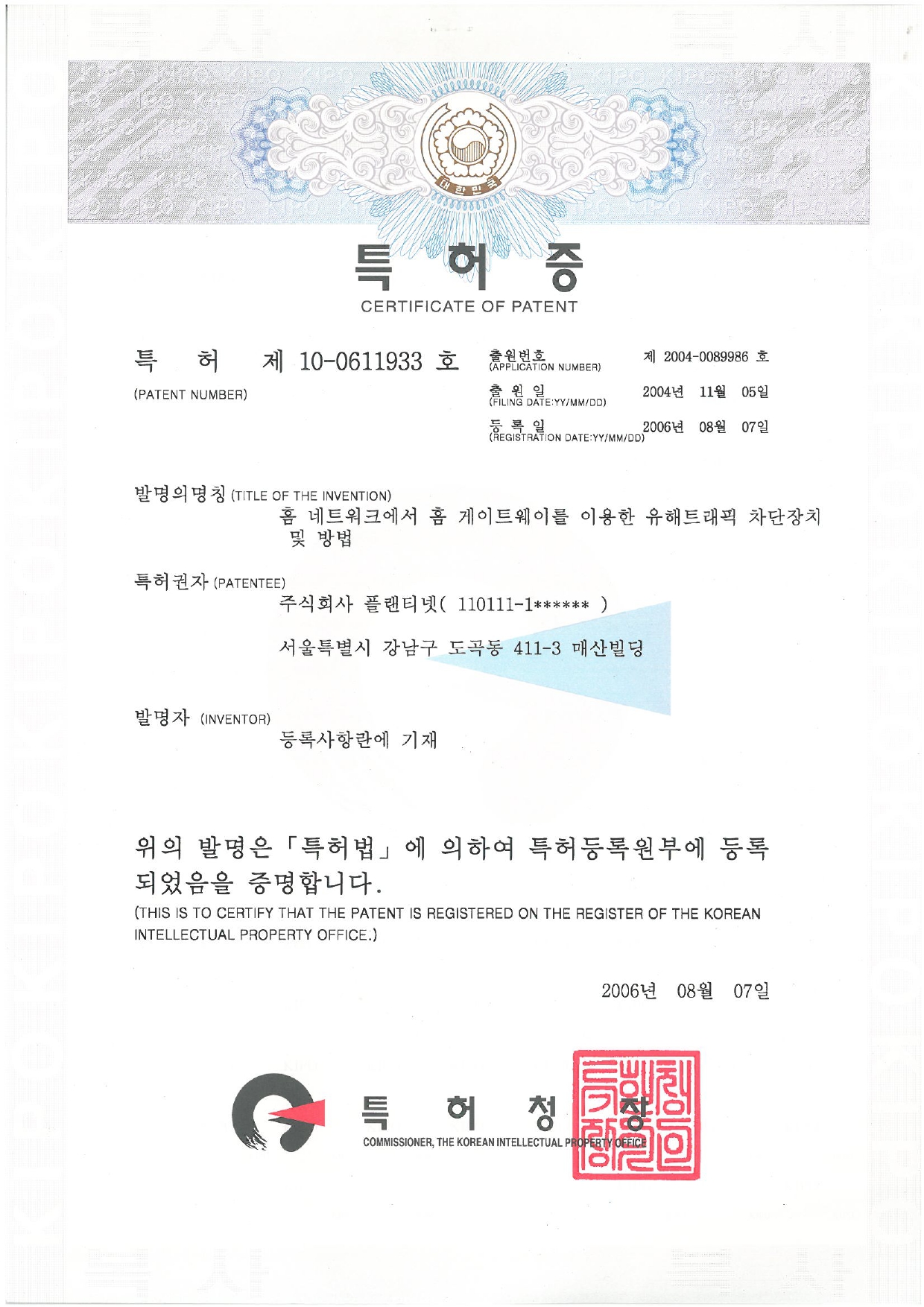 특허증(제10-0611933호)_홈 네트워크에서 홈 게이트웨이를 이용한 유해트래픽 차단장치 및 방법