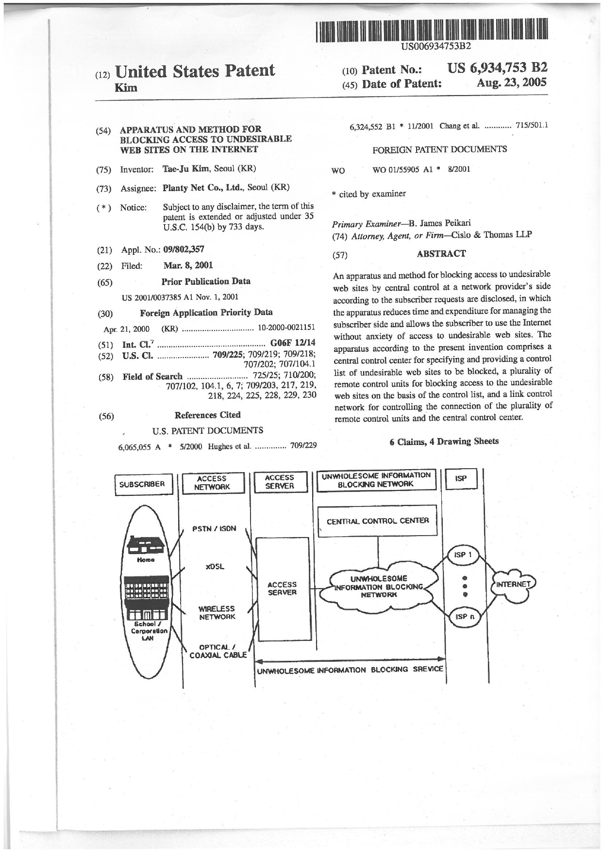 특허증(US 6,934,753 B2)_인터넷상의 바람직하지 않은 웹 사이트에 대한 액세스를 차단하는 장치 및 방법