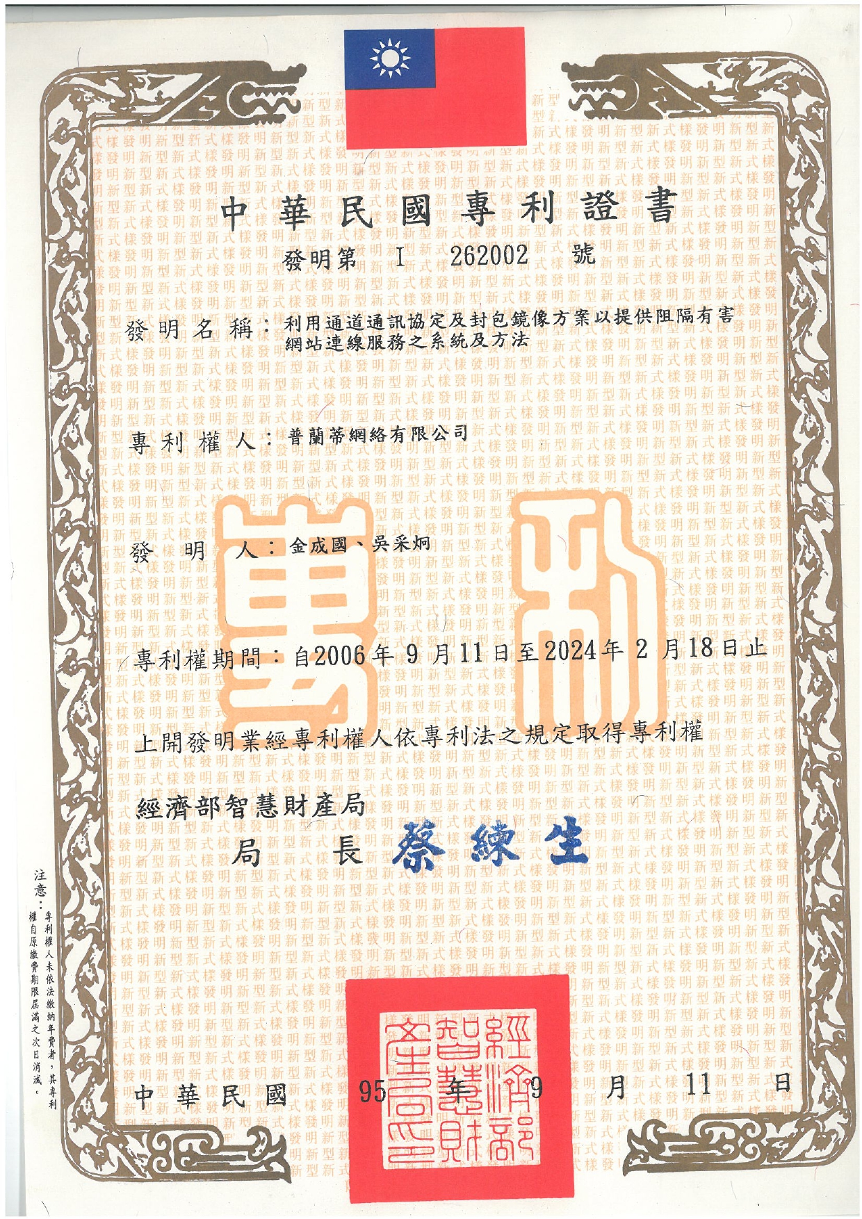 특허증(I 262002)_ 터널링 프로토콜과 패킷 미러링 기법을 이용하여 유해 사이트에 대한 연결 차단 서비스를 제공하는 시스템 및 방법
